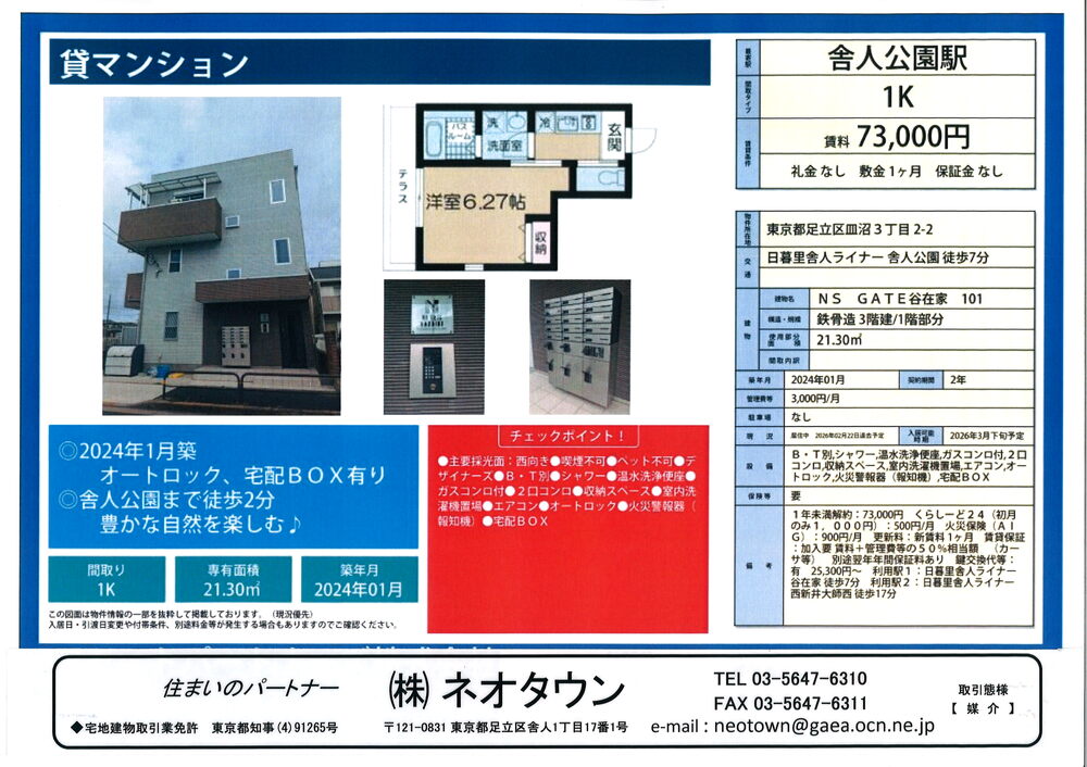 73,000円 利用駅:舎人公園駅 徒歩7分
